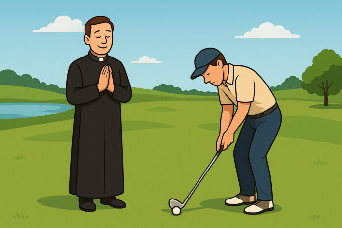 Một thanh niên nọ chơi gôn cùng một cha xứ. Đến một lỗ par-3 ngắn, cha hỏi: