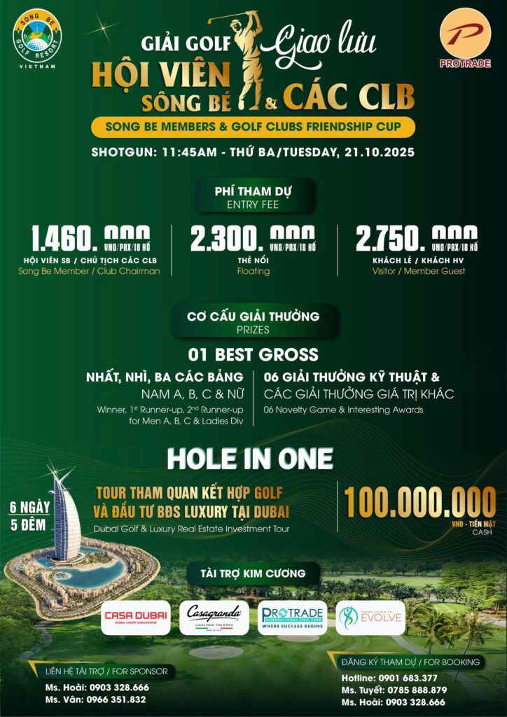 Đặc biệt, giải Hole In One năm nay mang đến phần thưởng hấp dẫn trị giá 100.000.000 VNĐ tại tất cả các hố Par 3, cùng tour 6 ngày 5 đêm tại Dubai, kết hợp chơi golf, tham quan và trải nghiệm đầu tư bất động sản hạng sang. Giải đang nhận được sự quan tâm nhiệt tình từ các golfer và các nhà tài trợ, đồng thời dự kiến sẽ bổ sung thêm nhiều phần thưởng giá trị khác, tạo thêm cơ hội thú vị cho những cú đánh chuẩn xác và trải nghiệm trọn vẹn không khí giải đấu.