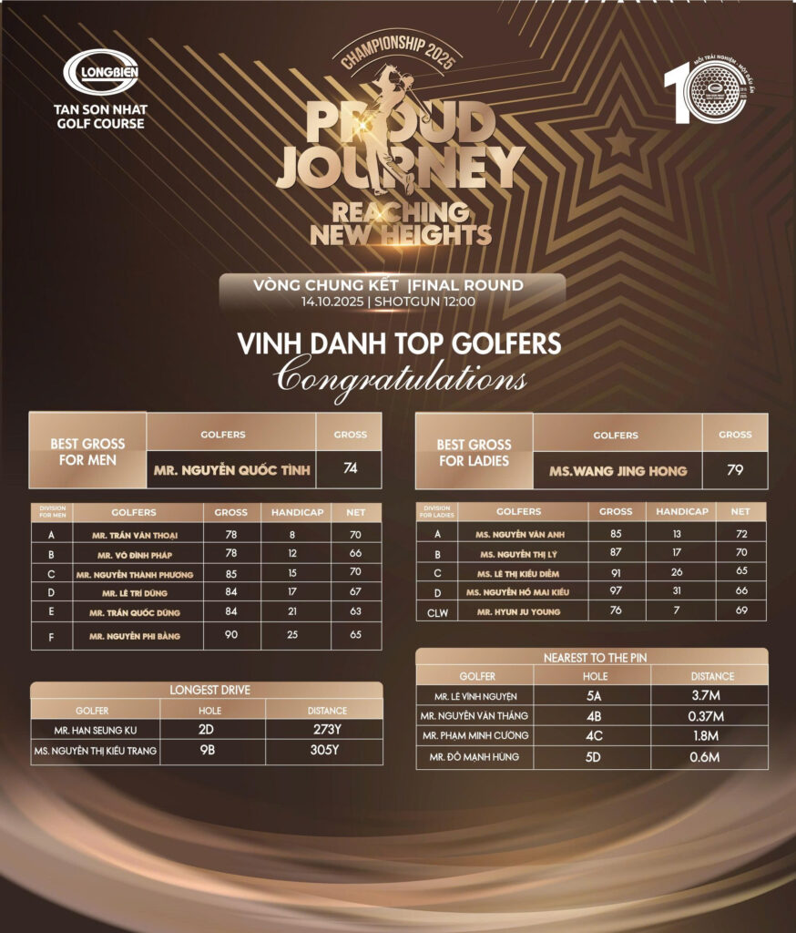 Ngày 14/10/2025, sau bốn vòng loại đầy kịch tính, Vòng Chung kết Tan Son Nhat Golf Course Championship 2025 với thông điệp “Proud Journey – Reaching New Heights” đã chính thức diễn ra tại Sân golf Tân Sơn Nhất.