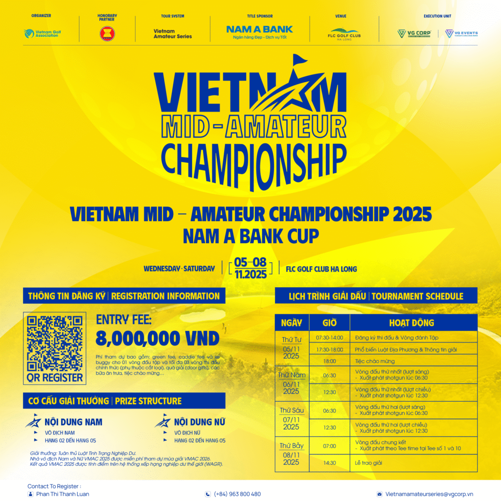 Một sân chơi hoàn toàn mới dành cho các golfer nghiệp dư trưởng thành chính thức ra mắt. Ngày 15/10/2025 tại Hà Nội, Hiệp hội Golf Việt Nam (VGA) tổ chức lễ công bố giải golf Vietnam Mid-Amateur Championship 2025 – Nam A Bank Cup, đánh dấu bước ngoặt quan trọng trong hành trình phát triển golf nghiệp dư Việt Nam.